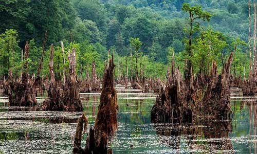 این تالاب مرموز که در دل جنگلهای انبوه شمال قرار دارد، به دلیل وجود درختان خشکیدهای که از آب بیرون آمدهاند، منظرهای رازآلود ایجاد کرده است. انعکاس درختان در آب تالاب، حس حضور در یک دنیای دیگر را القا میکند. این تالاب مقصدی ایدهآل برای عکاسان طبیعت است.